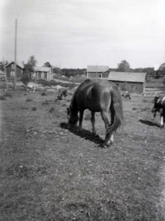 Till vänster syns det hus där Jungsund andelshandel verkade åren 1910–1962. Huset ses här från Padan Södersidon mot Sååndbro, bron över bäcken till Norra Jungsund. Fotografiet är troligtvis från 1950-talet. I förgrunden hästen Max från Mattas hemman. I bakgrunden vid högra kanten syns bostadshus på Back hemman. Där bodde senast Sven och Gunda Ingman. Deras gamla uthusrad revs på 1970-talet och ersattes av ett bilgarage. Tröskverkshuset vid landsvägen (bredvid nerfarten till Södersidon) köptes av Herman Mattas i början av 1960-talet. Det plockades ner byggdes upp igen som tillbyggnad (hölada) i vinkel till uthusraden vid Herman Mattas. Ladan står fortfarande invid vägkanten på Mattas hemman (första gården på vänstra sidan av Södersidsvägen). Det var därifrån boningshuset flyttades 1993 och blev bystuga.