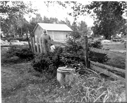 Erika Back (c:a 1955) vid brunnsgrinden till den samfällda brunnen på Pansarholmen.   Betydelsen som samlings-mötes och skvaldranställ om dagens nyheter var nog så viktig också!!