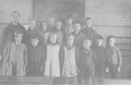 Lärarinnan Tea Sandström. Herbert Lindahl, ?, Frank Ingman, ?, ?, ?, ?. Främre raden: ?, ?, ? ,? ,?, Henrik Ingman, ?.