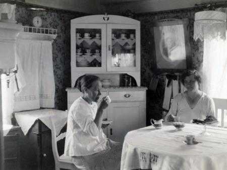 Amanda (född 1886) sitter till vänster vid sitt bord med besökare.
