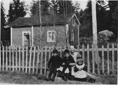 Ester Håkans med barnen Gustav, Alice och Arvid (födda 1922, -23, -24) framför sin och fiskaren Alfred Håkans torpstuga som fanns vid startplatsen för nuvarande vandringsled (Jungsundvägen 650). Fotot är taget 1926 i samband med att Alfred var på väg till Kanada, en resa som kom att räcka sex år. Under tiden arbetade Ester som piga på Skjäl hemman och skötte barn och torp ganska ensam, dock med en del hjälp av sina egna ogifta fastrar som bodde i närheten vilket hon brukade berätta om. Svärfar Johan Håkans hade avlidit 1924. Han hade hunnit skaffa elektricitet till stugan med en aktie i det nygrundade bolaget Gnistan samma år. En isolator syns uppe vid takkanten på torpet.