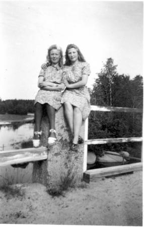 Kusinerna Linnea Håkans (f. Loo) och Gunhild Ström (f. Örn) på ”Nybråo”/ Iskmo bro ca 1939. Utsikt mot Iskmo sund österut. Bron var ofta sommartid en samlingsplats för ungdomen. Eftersom Iskmo och Jungsund råar tillvarandra mitt på bron kunde det till och med förekomma en del bråk på bron enligt Linnéa, men för det mesta var sämjan god. Man bruka säga att ”all je jo släkt me all”.