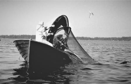 Harry och Anita Snygg från Iskmo vittjar strömmingsryssjan (senare delen av 1900-talet) utanför Tjärobådan, Iskmo Lillön.
